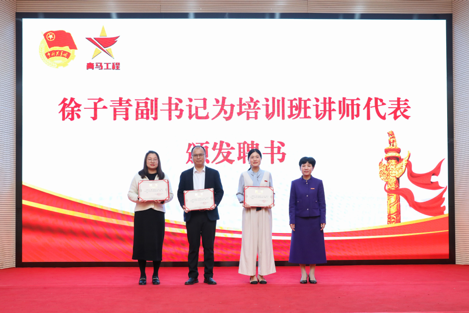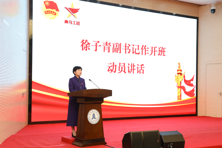 徐子青为培训班讲师代表颁发了聘书并为学员代表授旗。她在开班动员讲话中,充分肯定了学校“青马工程”培训班在推动马克思主义理论在青年中广泛传播、加强青年政治骨干培养实践探索等方面取得的成效,并向同学们提出三点要求:一要有“千磨万击还坚劲”的定力,在思想淬炼中固本培元。通过组织化、系统化的理论学习,树牢唯物史观、强化理论思维,不断增强对当代各种社会思潮的辨析甄别能力,在深学细悟笃行中筑牢信仰之基、补足精神之钙;二要有“扶摇直上九万里”的气魄,在实践锻炼中强筋壮骨。通过深入开展实践锻炼,磨练意志品质,培养优良作风,提高社会适应能力和综合素质,以实际行动带动和影响身边青年在实践淬炼中挺膺担当;三要有“打铁还需自身硬”的底气,在躬身奋斗中锤炼本领。真学真懂真用马克思主义,在经风雨、见世面中增才干、长本事、练本领。她希望同学们时刻铭记习近平总书记对广大青年的嘱托,接过时代的接力棒,扎实践行“请党放心,强国有我”的青春誓言,不断用党的创新理论武装头脑,为中华民族伟大复兴奉献自己的青春和力量。