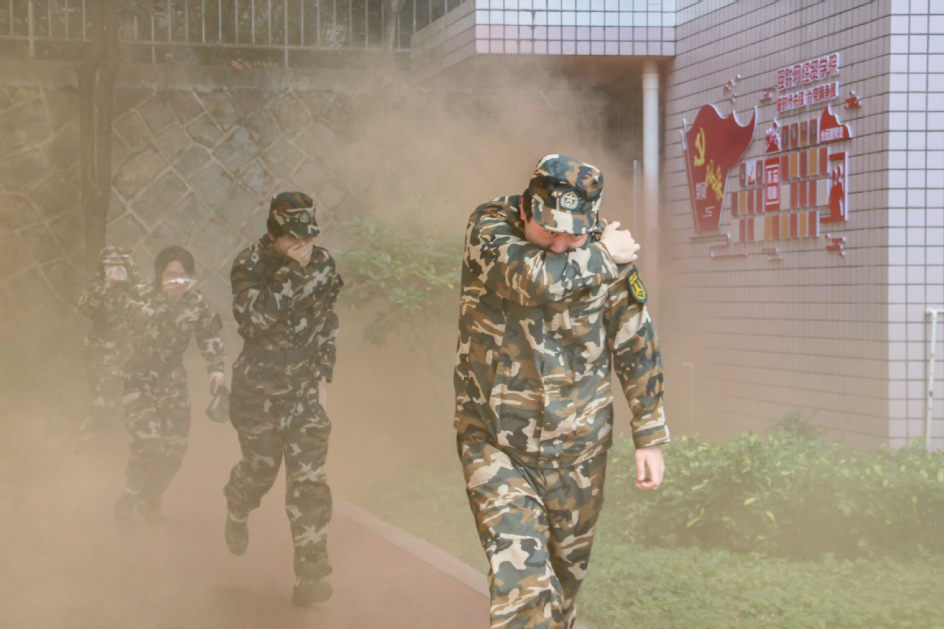 演习通过设置烟雾点等方式营造出不同的场景。辅导员、现场指挥人员指挥各班级按预定路线有序疏散到安全区域,及时清点人员情况并上报。演练后,军训教官开展了安全应急知识讲解。