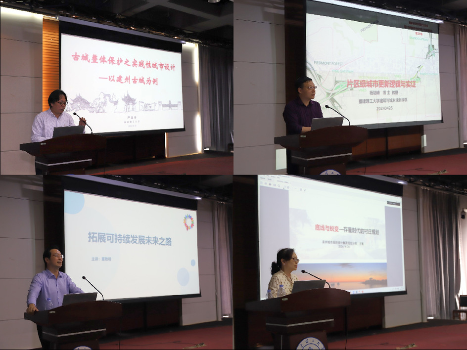 随后举行了系列主旨报告和国土空间规划和城市设计创新发展论坛。福建省勘察设计大师、福建理工大学建筑与城乡规划学院严龙华教授,福建理工大学建筑与城乡规划学院院长杨培峰教授,福州市规划设计研究院集团有限公司副总规划师董敬明,泉州城市规划设计集团有限公司规划分院院长王敏教授分别以《古城整体保护之实践性城市设计—以建州古城为例》《片区统筹视角下的城市更新策略研究》《拓展可持续发展未来之路》《底线与蜕变——存量时代背景下的村庄规划》为题作了主旨报告。严龙华、杨培峰、王敏、董敬明、吴正隆、林坤耀、陈弼成、陆绍梅等专家围绕国土空间规划和城市设计领域的多个议题进行了热烈研讨,为与会师生带来了一场学术盛宴。