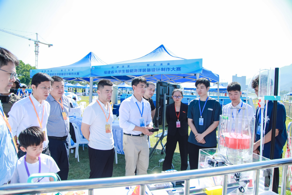 11月9日上午,大赛在旗山湖公园北广场开幕。福建理工大学校长韦建刚,福建省委教育工委原书记、省教育厅原厅长、福建理工大学智慧海洋科学技术学院·智慧海洋与工程研究院管理委员会主任黄红武,福建理工大学党委副书记徐子青、副校长吴琛,中船蓝荟海洋装备会展有限公司董事长华承昌,福州市鼓楼区发展和改革局副局长郑世鸿,福州首邑产业投资集团有限公司副总经理黄琳以及10多家参加企业表演赛的参赛参展代表、福建理工大学师生等参加开幕式。