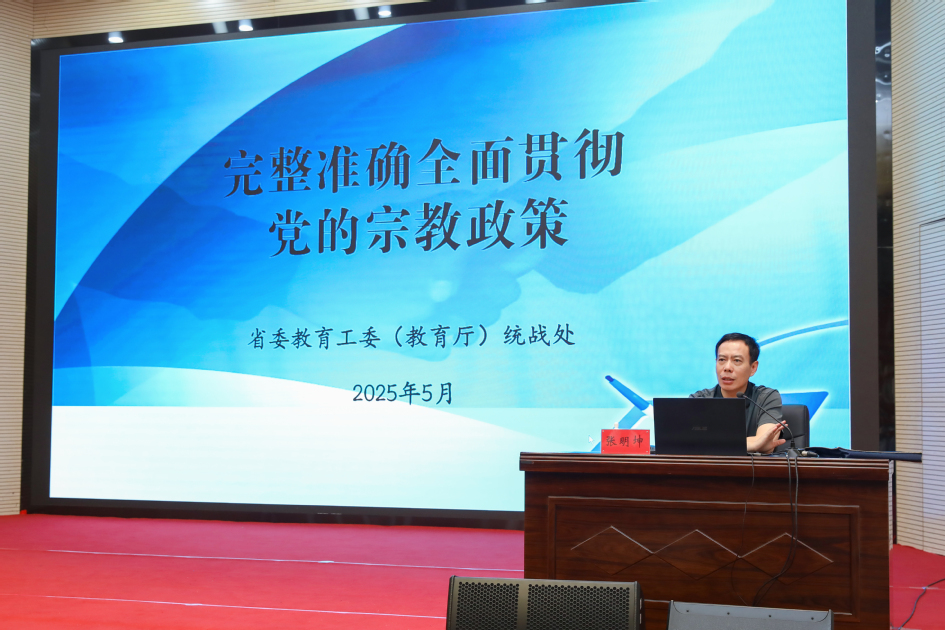 会上,张明坤以《完整准确全面贯彻党的宗教政策》为主题,系统解读了新时代党的宗教政策,分析了当前高校宗教工作面临的形势和任务,同时结合高校典型案例,分享了行之有效的工作策略,进一步增强了广大干部做好宗教工作的责任感、使命感,强化了宗教政策法规意识,提升了业务工作水平。