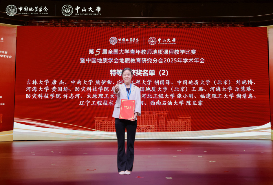 10月24日至26日,第五届全国大学青年教师地质课程教学比赛在珠海举行,来自全国68所高等院校的160余名青年教师同台竞技。我校土木工程学院教师谢清惠凭借优异表现,荣获大赛特等奖,充分展现了我校青年教师扎实的教学功底、先进的教学理念和良好的专业素养。