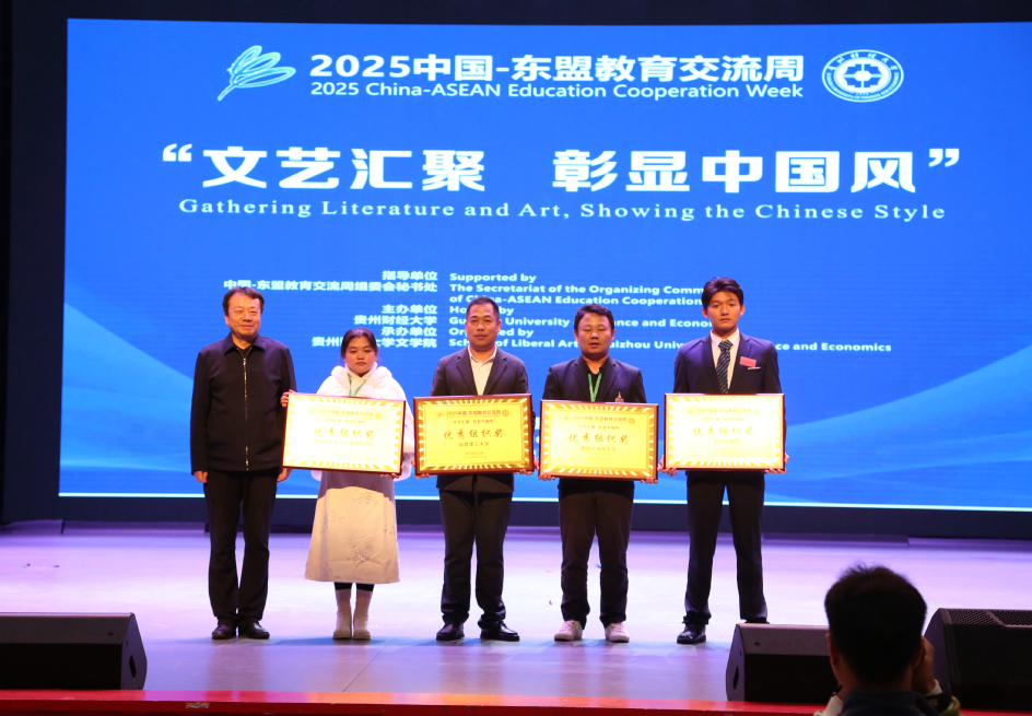 11月15日,2025中国-东盟教育交流周“文艺汇聚,彰显中国风”中华才艺展示决赛在贵州举行,来自国内外多所高校的100余名留学生参加活动,参演人员涵盖泰国、老挝、柬埔寨、越南、缅甸、俄罗斯、马来西亚等11个国家。我校首次参加该活动并荣获“优秀组织奖”,人文学院教师指导的朗诵《悯农》《面朝大海,春暖花开》、歌曲《登鹳雀楼》、书法《福禄寿喜》、舞蹈《泰爱中国,心连华夏》等5件作品入围才艺展示。