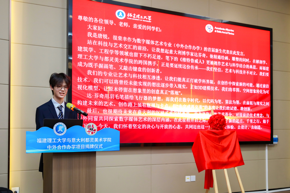 Salvatore Bitonti向新生代表们颁发了欢迎信,勉励他们在中意文化交融中成长为具有国际视野的创意人才。新生代表唐锐在发言中表达了对未来学习的期待与信心,表示将珍惜学习机会,努力成为中意文化交流的桥梁。