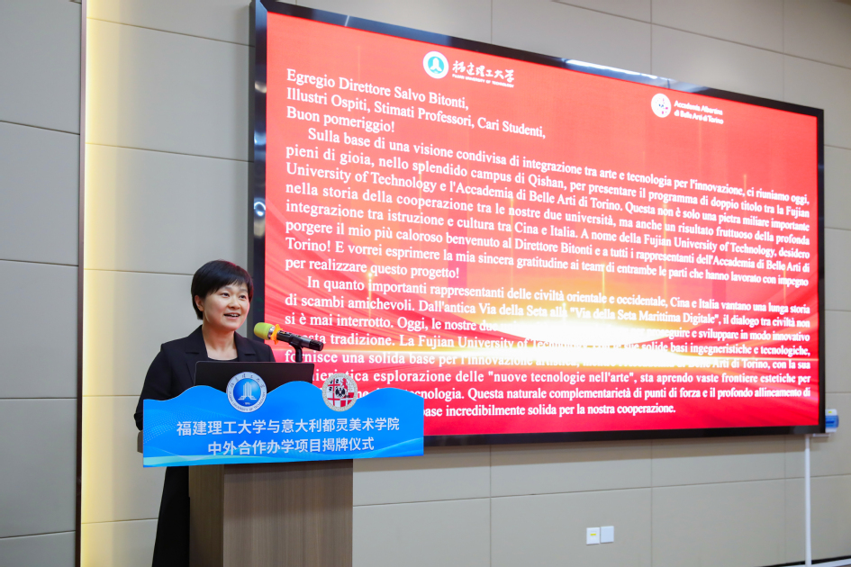 仪式上,吴琛代表学校向都灵美术学院代表团表示热烈欢迎,指出此次合作是两校在教育国际化进程中迈出的重要一步,也是中意两国在艺术与科技融合领域深化合作的生动实践。她表示,学校将以深厚的工程技术底蕴与都灵美术学院在“艺术新技术”领域的领先优势相结合,共同打造数字媒体艺术人才培养的新高地。