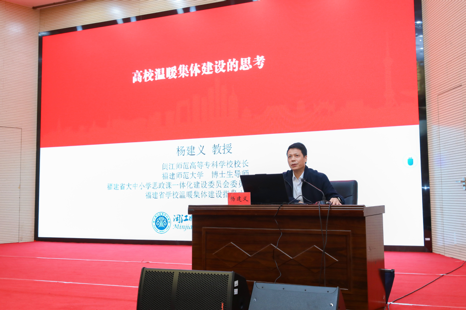 11月25日上午,学校在旗山校区学术报告厅举办温暖集体建设专题辅导报告会,闽江师范高等专科学校校长杨建义教授应邀作专题报告。校党委副书记徐子青主持会议,有关机关部处负责人,各学院党委负责人、团委书记及全体辅导员参会。