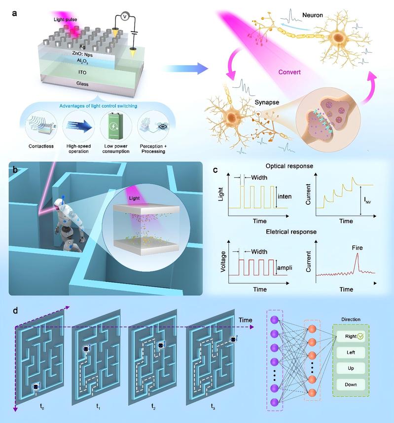 光控突触—神经元功能可重构透明忆阻器及迷宫导航应用示意图